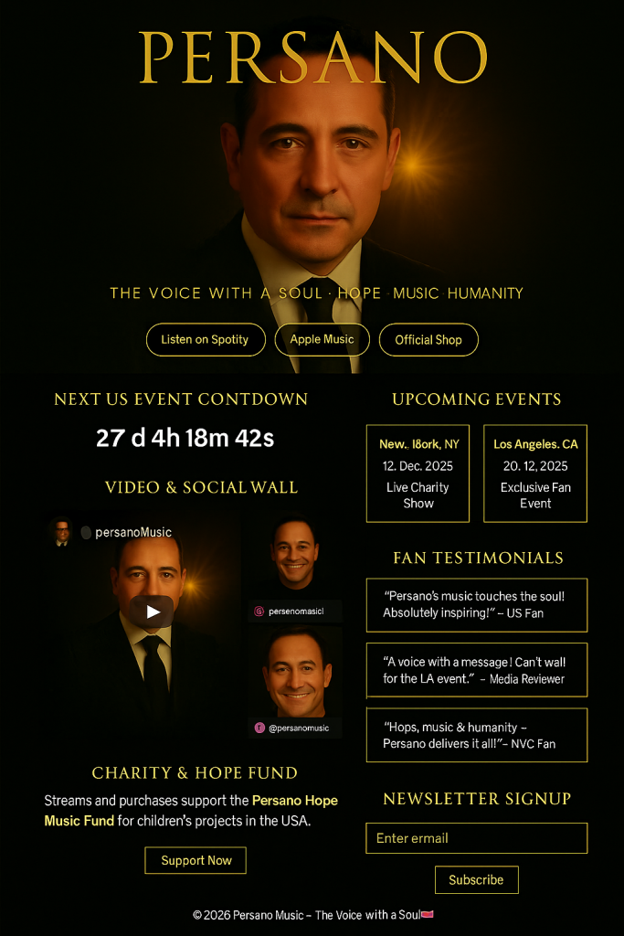 Persano Global Overview 2026 presents the full international visibility of Persano – The Voice with a Soul. This page brings together the global music presence, press features, country-specific highlights, and major humanitarian messages that define Persano’s work around the world.