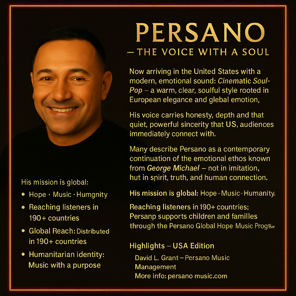 With his mission “Hope · Music · Humanity”, Persano positions himself as a global artist who brings emotional storytelling and heartfelt authenticity to the U.S. music landscape. His voice — warm, honest and cinematic — connects naturally with American audiences, radio formats and streaming platforms.